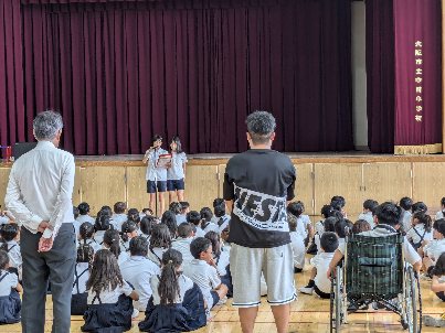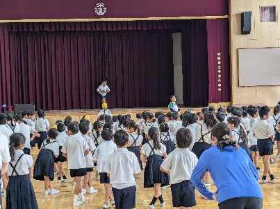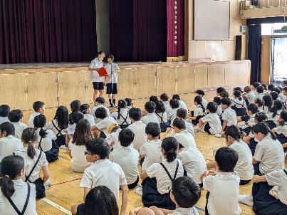 講堂で児童集会を行いました。運動委員会の姿勢ストレッチに続いて、校長先生から、オリンピックとオリンピアンについてのお話がありました。 その後に、看護当番から先週の反省と今週の目標についての話がありました。