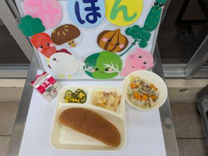今日のメニューは、鶏肉とてぼ豆のスープ煮・ベーコンとじゃがいものチーズ焼き・きゅうりとコーンのサラダ・黒糖パン・牛乳です。