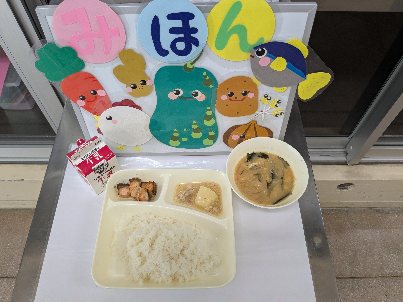今日の献立は、さけのしょうゆ風味焼き・みそ汁・とうがんの煮物・ごはん・牛乳です。