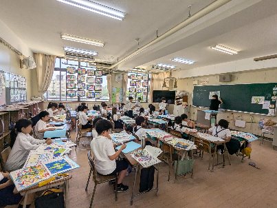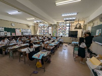 図画工作科の授業の様子です。1学期に作った作品を整理していました。2年生の思い出として、まとめて作品集にしています。