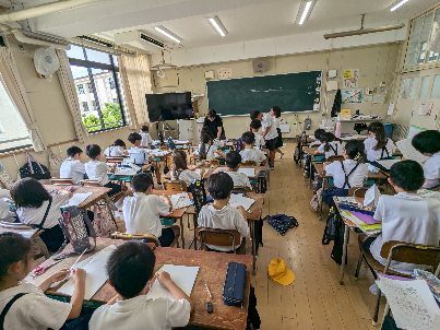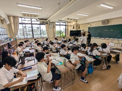 学級活動の授業の様子です。夏休みの宿題や提出物等を点検していました。英語のプリントもファイルにして閉じていました。みんなが分かるようにローマ字と日本語で書いていました。
