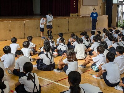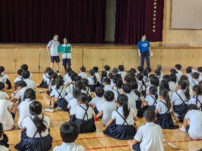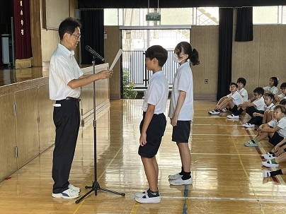 講堂で全校朝会を行いました。まず最初に、新スポーツテストで、東成区内の小学生の中でよい成績を修めた2人の表彰を行いました。続いて看護当番から先週の反省と今週の目標についての話がありました。