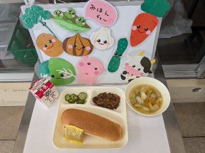 今日のメニューは、牛肉のソース煮・スープ・きゅうりのピクルス・コッペパン・アプリコットジャム・牛乳です。