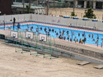 水泳の授業の様子です。泳ぎの基本である、けのび・ふし浮きを練習していました。きれいなフォームで長い距離を泳ぐためには、大切な練習です。けのびふし浮きの上手な人は、それだけで10メートル以上進めます。がんばりましょう。