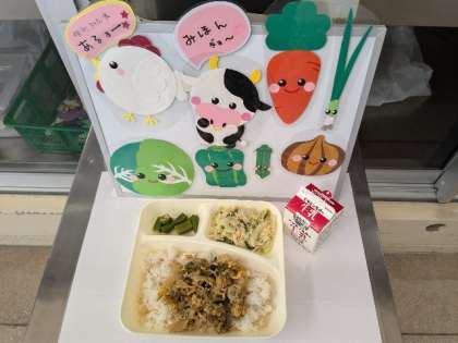 今日の献立は、他人丼・ささみと野菜のいためもの・オクラの甘酢あえ・牛乳です。