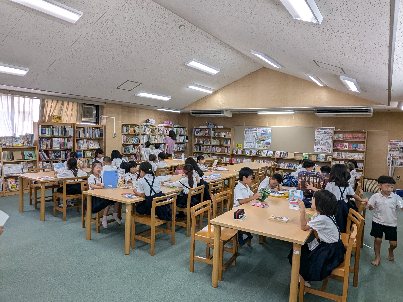 図書館での読書活動の様子です。自由読書を楽しんでいます。子ども達は、図鑑だとか絵本だとか物語とか、興味のある本を読んでいました。いろいろなジャンルの本を読んで、読書好きになってください。