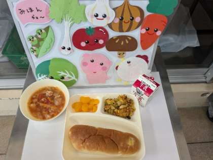 今日のメニューは、カレーマカロニグラタン・トマトスープ・みかん(缶)・おさつパン・牛乳です。
