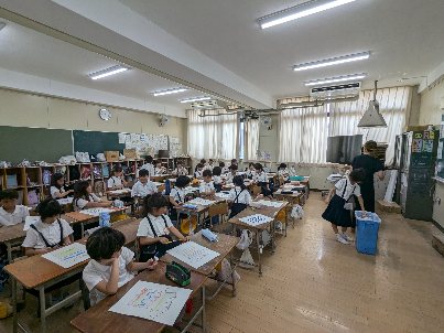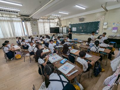 図画工作科の授業の様子です。絵の具を使ってTシャツのデザインをしていました。今は、自分がデザインしたものをTシャツにプリントできるので、作ってみるのもいいですね。