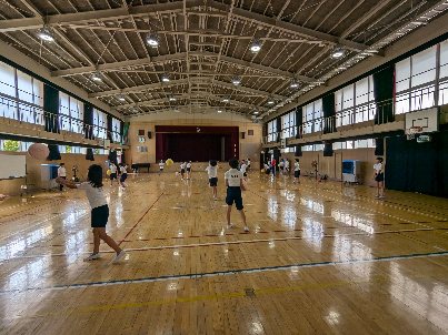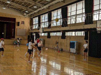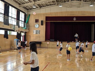 体育の授業の様子です。講堂でソフトバレーボールの練習をしていました。2人組で、パスの練習をしていました。子ども達にとってボールゲームは、楽しい学習の一つですね。試合をする日が待ち遠しいですね。