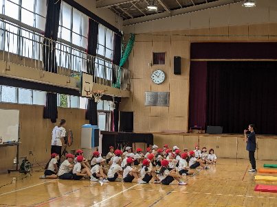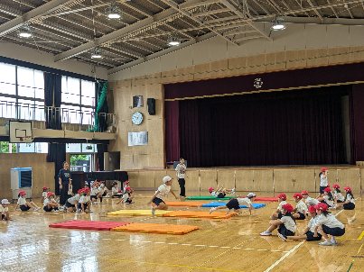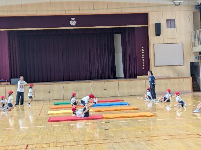 体育の授業の様子です。講堂でマットを使った運動をしていました。今日は、自分の得意な連続技に挑戦していました。みんな自信のある技を披露していました。