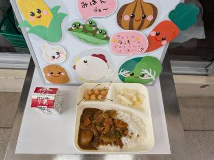 今日の献立は、チキンカレーライス・キャベツとコーンのサラダ・さくらんぼ(缶)・牛乳です。