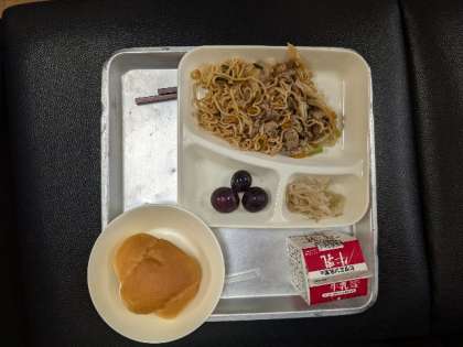 今日のメニューは、オイスターソース焼きそば・もやしのしょうがづけ・ぶどう(巨峰)