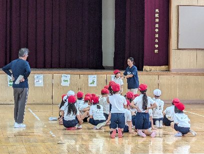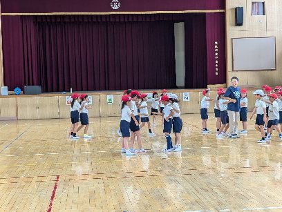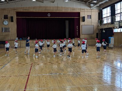 体育の授業の様子です。講堂でリズムに合わせて運動をしていました。秋の空気に包まれ、劇的に涼しくなった講堂をいっぱいに使って、駆け足をしながらじゃんけん列車をしていました。