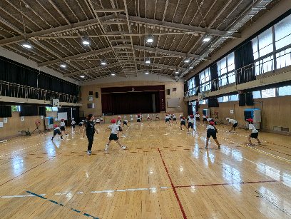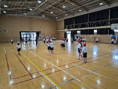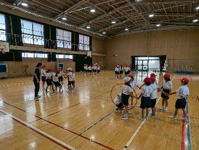 体育の授業の様子です。貨物列車でグループ分けをして、フープを使った運動をしていました。グループの対抗戦だったのでみんな一生懸命がんばっていました。
