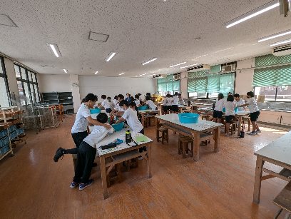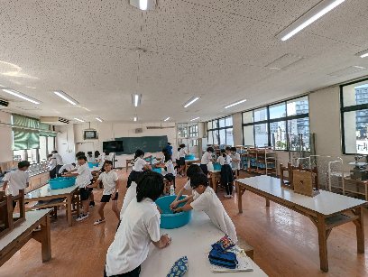 家庭科の授業の様子です。家庭科室が使えないので、図工室で洗濯実習をしていました。ハンカチ等を手もみ洗いしていました。今の子ども達は、手洗いにどんな感想をもつのか気になりました。手洗いも必要と思うのか、洗濯機があればいらないと思うのか、どうでしょうか?