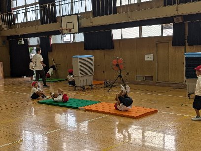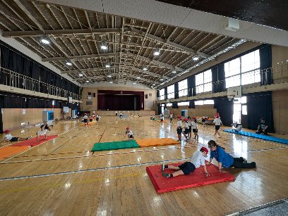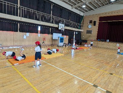 体育の授業の様子です。講堂で、マットを使った運動遊びをしていました。、それぞれのグループで違った運動をしていました。前回りをしたり、ゆりかごや壁倒立をしていました。すごいですね。けがのないようにがんばりましょう。