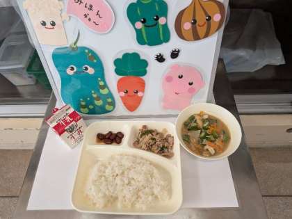 今日の献立は、豚肉の甘辛焼き・とうがんのみそ汁・金時豆の煮もの・ごはん・牛乳です。