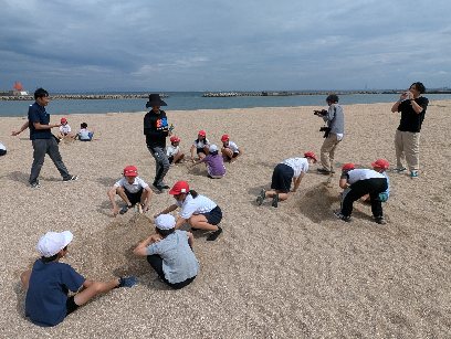 続いて、作った山の山崩しをしました。スコップを倒した人が、6年生になったときの心構えを発表していました。