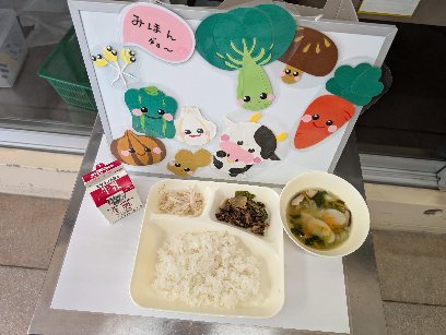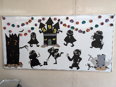 10月の掲示物です。今や定番のハロウィンです。調理員さんたちの手作りです。上手ですね。