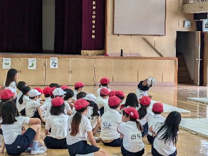 体育の授業の様子です。講堂で、マット運動のテストをしていました。みんなの前で技を披露していました。みんな得意な技でテストを受けていました。うまくできたのでしょうか。