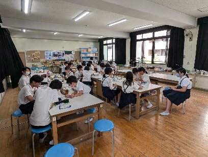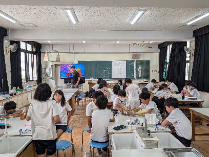 理科の授業の様子です。理科室で、水溶液の性質についての実験をしていました。スチールウールやアルミ箔を試験管の中で溶かす実験です。体につくと危険なので子ども達は、ルールを守って実験をしていました。