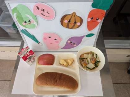 今日のメニューは、中華煮・大学いも・りんご・黒糖パン・牛乳です。中華煮は、野菜がたっぷりで、味もよくおいしかったです。大学いもは、蜜の味が最高で、いもと絡みおいしかったです。リンゴは旬の果物です。75日長生きできそうです。