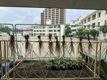 10月2日(水)の委員会でお米(バケツ稲)の収穫をしました。収穫した稲を干しています。さつまいも掘りの時期もあと少しです。楽しみです。