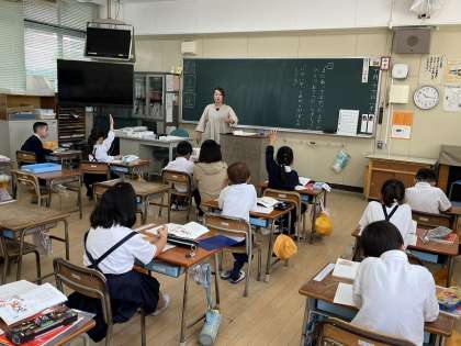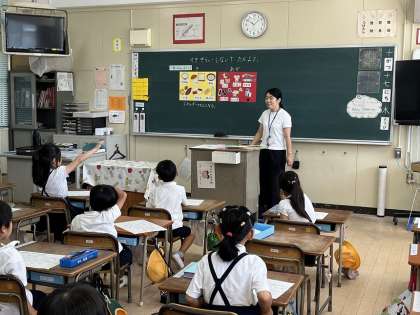 1年2組は、栄養教育。東小橋小学校の先生から「すききらいせずにたべよう」のテーマで3色に分けられた食べ物をバランスよく食べることの大切さについて教えていただきました。1年1組も3時間目に授業をしていただきました。
