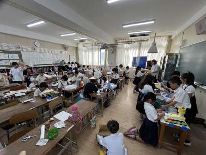 2年1組は、図工「おもちゃづくり」。車輪のついた車を家から持ってきた材料を使って作りました。