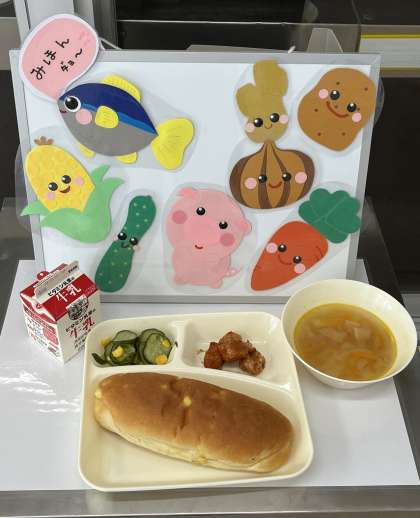 今日の献立は、まぐろのオーロラ煮、スープ、きゅうりとコーンのサラダ、おさつパン、牛乳です。