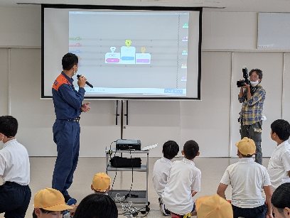 胸骨圧迫の体験をしています。グループ対抗で練習しています。順位も出ます。