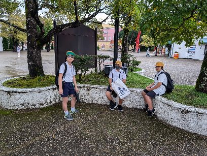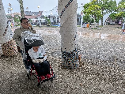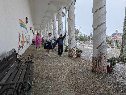 スペイン村でのグループの様子です。雨の中でも、みんな乗り物に乗れました。よかったです。雨の中でもいい思い出ですね。