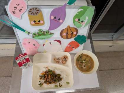 今日の献立は、モズクと豚ひき肉のジューシー・さつまいものみそ汁・焼きれんこん・牛乳です。