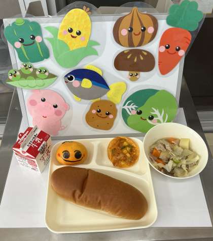 今日の献立は、豚肉と野菜のスープ煮、変わりピザ、みかん、黒糖パン、牛乳です。