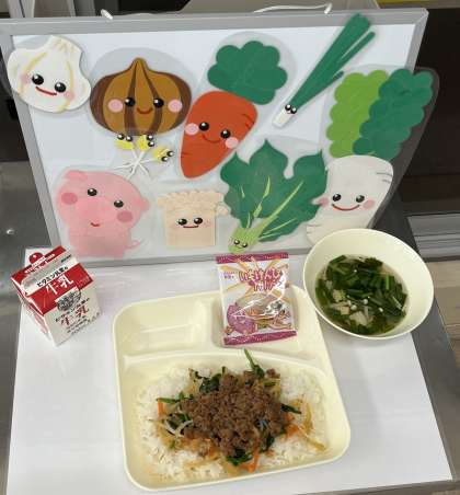 今日の献立は、ビビンバ(肉・野菜)、わかめスープ、いもけんぴフィッシュ、牛乳です。ビビンバに使われている「ほうれんそう」は、中国の唐の時代にホリン国(ネパール)から伝わったことから日本でもほうれんそうと呼ぶようになったそうです。日本には戦国時代末期に中国から伝わりました。ほうれんそうは、体の調子を整える食べ物で、冬が旬の野菜です。寒い時期のほうれんそうは、甘みが増してさらにおいしくなります。
