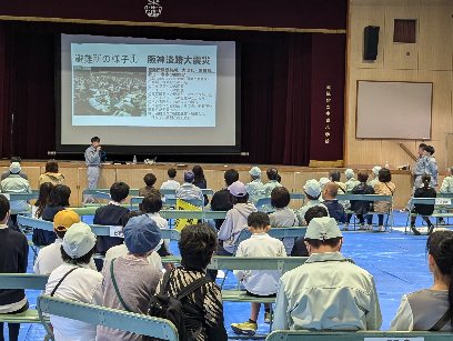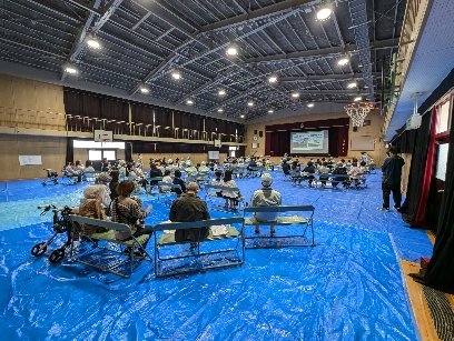 講堂で地域の方と一緒に、区役所の人の避難所運営ゲームの説明を聞いていました。画像を見ながら避難所を開設する時の大切なポイントを聞いていました。この後みんなで協力して運営ゲームを行います。がんばりましょう。