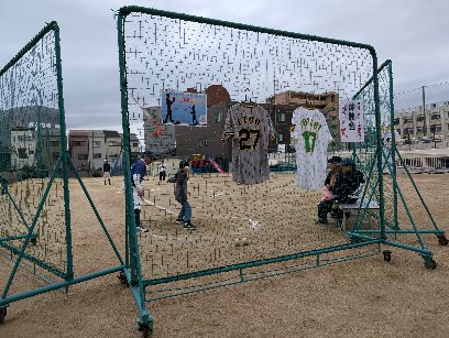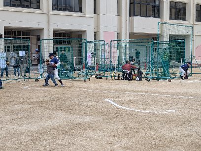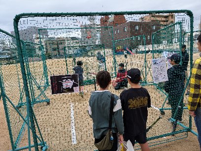 運動場では、子ども会のソフトボールチームが体験コーナーを開いています。子ども達は、打ったり投げたり楽しんで体験していました。