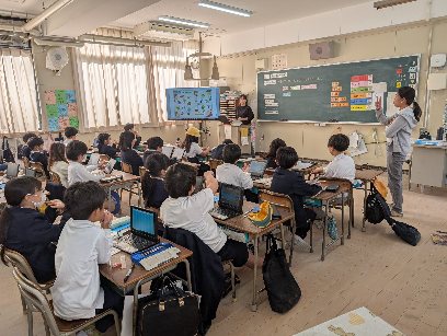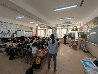 外国語活動の授業の様子です。(What do you like〜?)何の食べ物が好きかで、会話をしていました。タブレット端末を使って、食べ物カードを選んでいました。みんな好きなものを発表できていました。