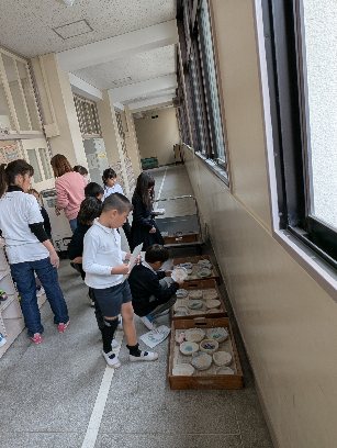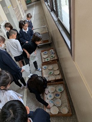 図画工作科の授業の様子です。陶芸作品を作っていました。焼く前の作品に色付きのガラスを入れていました。焼き上がるとガラスが溶けてきれいな模様になります。どんな感じになるのかは、焼いてみないと分かりません。楽しみですね。
