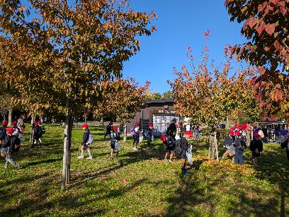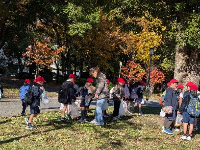落ち葉をひろっています。公園は、紅葉が美しいです。