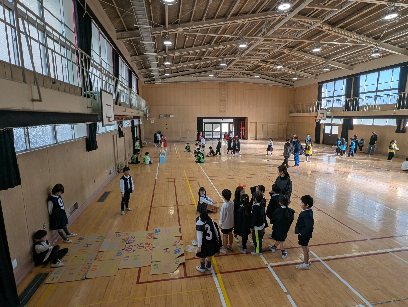 講堂でおもちゃランドをしていました。2年生が作ったおもちゃのお店に、1年生が招待されて、いろいろな遊びを体験していました。お店を開いている2年生も、お客さんの1年生も、共に笑顔で楽しいそうでした。いい交流ができました。