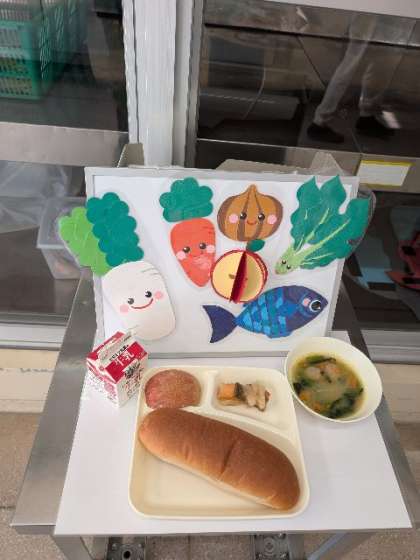 今日のメニューは、さけのマリネ・肉だんごとおし麦のスープ・りんごです。
