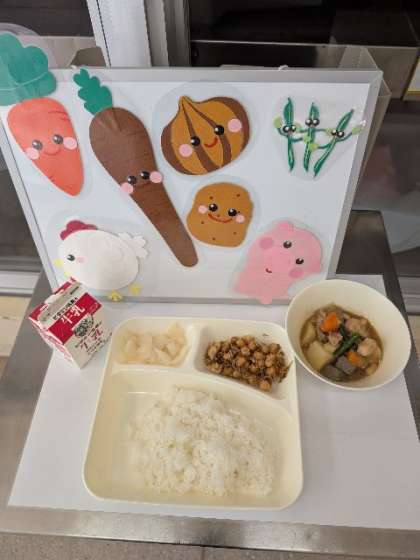 今日の献立は、鶏肉と野菜の煮もの・じゃこ豆・かぶのゆず風味・ごはん・牛乳です。