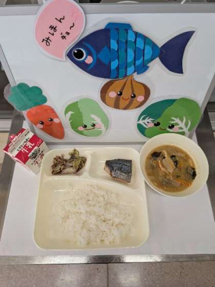 今日の献立は、さごしのしょうゆだれかけ・みそ汁・キャベツの赤じそあえ・ごはん・牛乳です。