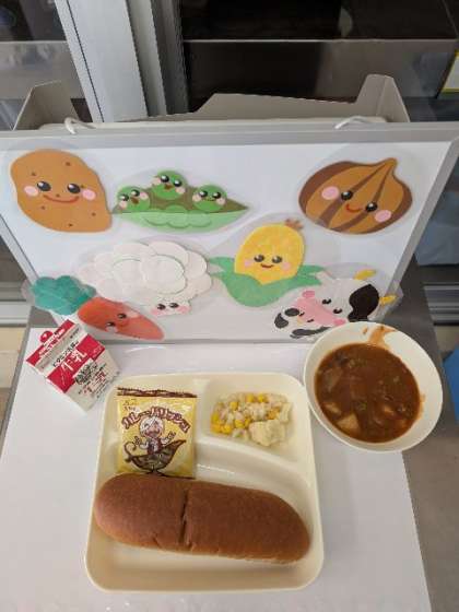 今日のメニューは、ビーフシチュー・カレーフィッシュ・カリフラワーとコーンのサラダ・黒糖パン・牛乳です。