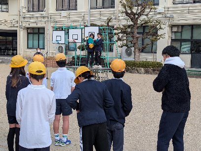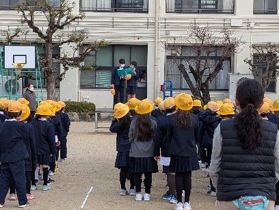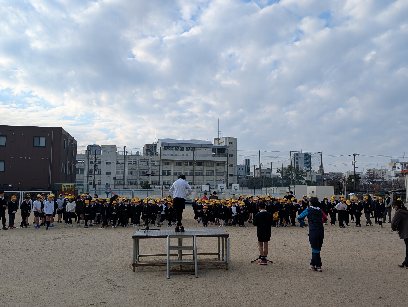 運動場で3学期1回目の全校朝会を行いました。運動委員会の姿勢ストレッチに続いて、校長先生から、冬の体力づくりについてのお話がありました。その後に看護当番から、先週の反省と今週の目標についての話がありました。