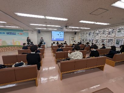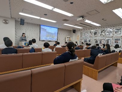 係の方からのお話を聞いています。この後、社内の見学に行きます。見学中は撮影禁止なので、HPにアップできません。