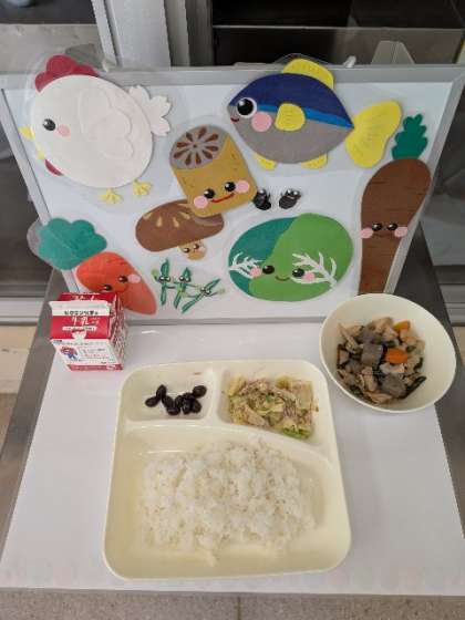 今日の献立は、筑前煮・ツナとキャベツのごまいため・黒豆の煮もの・ごはん・牛乳です。