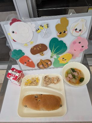 今日のメニューは鶏肉のからあげ・ハムと野菜の中華スープ・もやしとコーンの中華あえ・レーズンパン・牛乳です