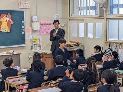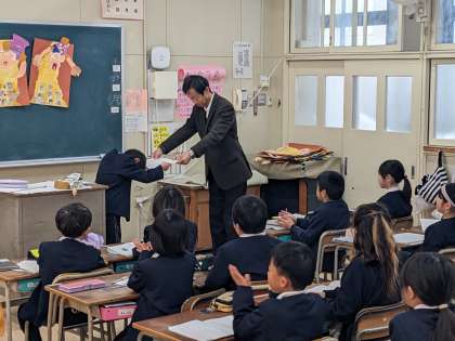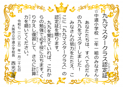 表彰の様子です。2年生全員が、九九をマスターしたことを表彰しました。校長先生から代表の子に、賞状が手渡されました。みんなよくがんばって覚えました。